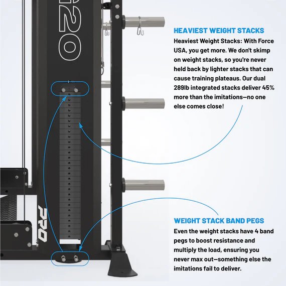 Le nec plus ultra, sans compromis. Ce modèle compact combine 11 stations de musculation. Les colonnes de poids les plus lourdes du marché. Ses deux colonnes de poids de 131 kg (289 lb) offrent une capacité de charge 45 % supérieure à celle des modèles concurrents. Un espace intérieur des plus hauts et des plus spacieux. Avec une hauteur de 231 cm (91 po) et une profondeur de 152 cm (60 po), profitez d’un des espaces de travail intérieurs les plus vastes du marché. Poulies 2:1 ultra-pratiques. Les poulies 2:1 réduisent automatiquement le poids de moitié, pour des mouvements plus fluides et contrôlés, améliorant ainsi la stabilité et la posture. Accrochez facilement votre équipement. Le bras de 1,5 m (5 pi) se déploie, se replie et permet d’accrocher tout type d’équipement sans percer, même un sac de frappe ! Une stabilité à toute épreuve. Ne vous contentez pas de pieds instables. Notre conception à cadre bas et nos coussinets stabilisateurs offrent une stabilité à toute épreuve. Option exclusive pour le haut du corps : Force USA propose en exclusivité une station de tirage vertical à 90 degrés, de tirage horizontal et de dips, avec une charge supplémentaire de 131 kg et des poulies à rapport 1:1 pour un développement optimal du haut du corps.