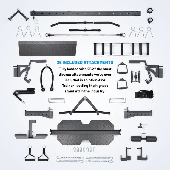 Un système d'entraînement « tout-en-un » complet et compact. ✓ Appareil de musculation fonctionnelle à double poulie réglable (2 colonnes) ✓ Machine Smith à contrepoids ✓ Demi-rack avec supports en J et pareurs ✓ Barre de traction intégrée