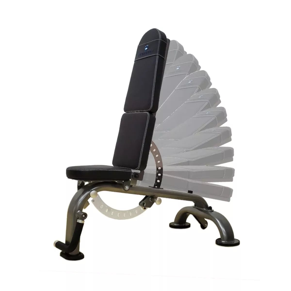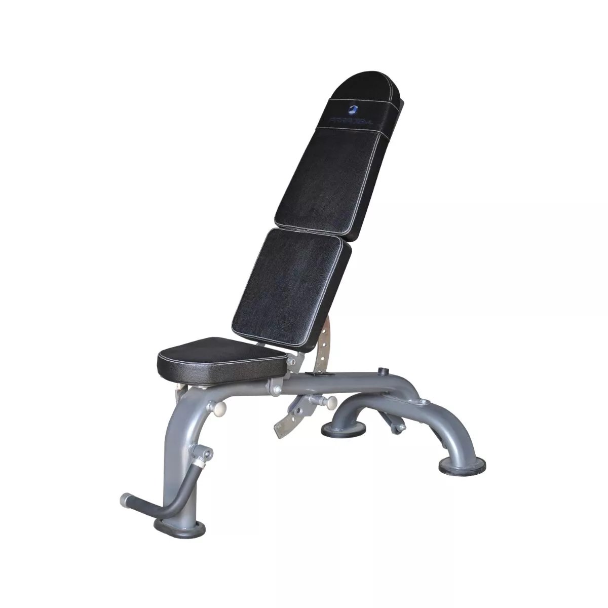 Banc utilitaire F705 F/I/D. Robuste et conçu pour une polyvalence optimale, notre banc commercial F705 FID est imbattable. Envie de changer d'exercices ? Aucun problème ! Grâce à notre système de réglage facile à l'échelle, l'utilisateur peut choisir parmi sept positions différentes, allant d'une inclinaison de -20°* à une position verticale de 85°. La poignée de levage intégrée et les roulettes de transport facilitent le déplacement et le rangement du banc en position verticale. Sa stabilité à trois points et ses pieds en caoutchouc garantissent une parfaite stabilité. Le confort, le style et la compatibilité avec les accessoires ont été pensés avec soin, ce qui confère à ce banc un avantage considérable sur tous les autres. *Remarque : Ce banc ne comprend pas de support pour les jambes. Le kit de support/fixation pour les jambes F715 est disponible en option. Le F715 permet d'utiliser l'extension de jambes F711 et la flexion des bras F710.